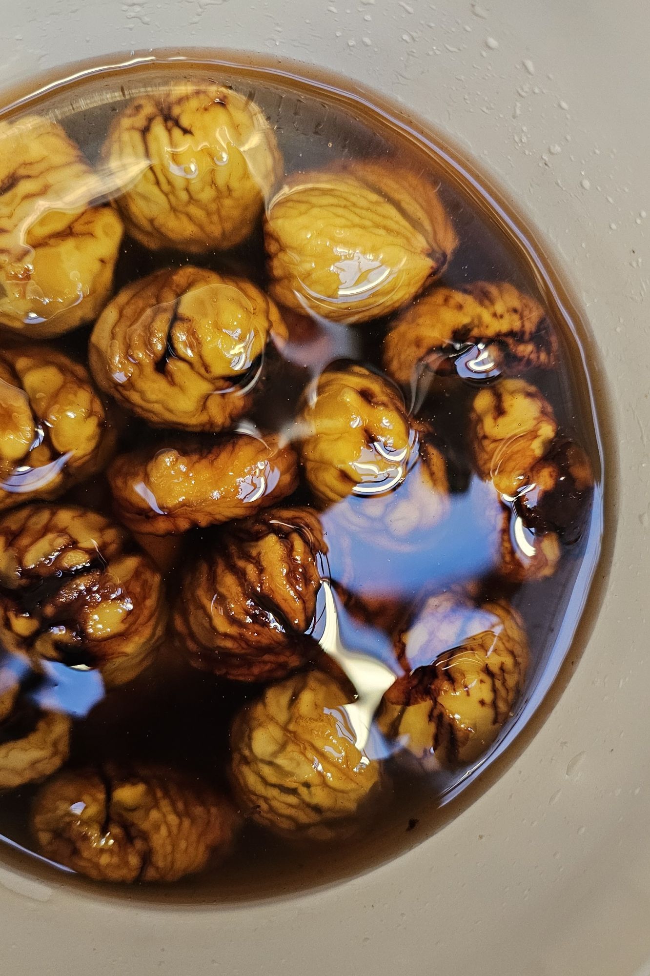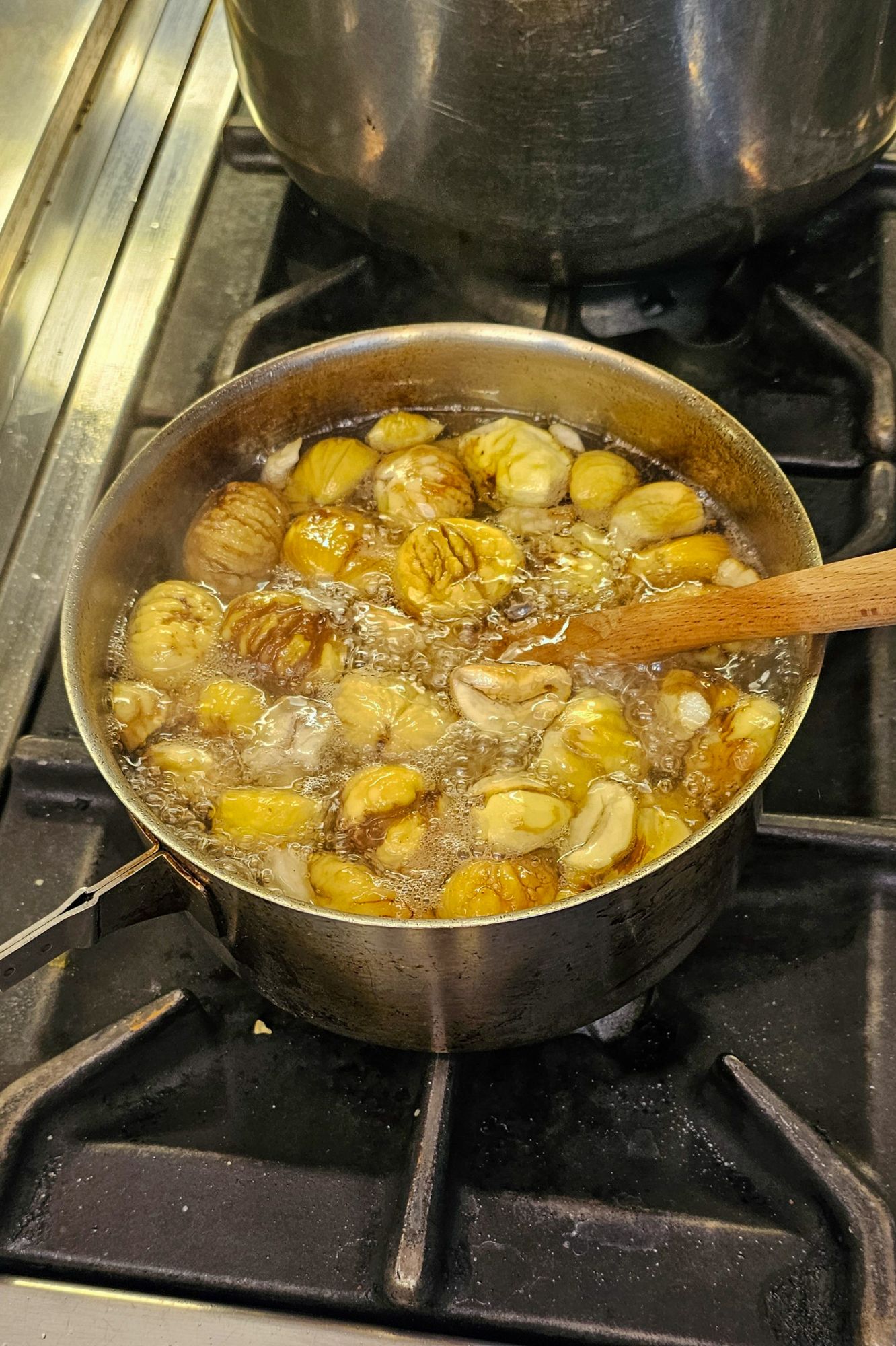Then came the “easy” part: boiling them in syrup — equal parts chestnuts, sugar, and water — for a few hours.